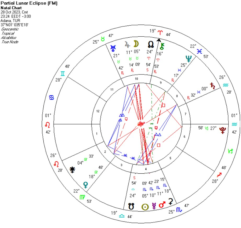 Merkür ve Mars’ın Akrep’te 3.evde oluşu; iletişim ağında sorunlar, gizli bilgilerin basın yayın medya/sosyal medya yolu ile (Merkür Akrep ve Ay Jüpiter Boğa karşıt ve Ay 11ev yöneticisi) açığa çıkması (Güneş Akrep). Ayrıca Merkür hem Asc hem de otorite figürleriyle ilişkili 10.ev lordu. Ülke yönetim şekline dair bilgilerle ilişkili güvenlik krizi yaşanabilir. Tutulma enerjisiyle girdiğimiz yıllık haritada maden kazalarına karşı dikkat edilmesi gereken zamanlar. Güneş Akrep Satürn Balık üçgeni yönetici konumundaki kişilerin sağlık sorunlarına da vurgu yapıyor.