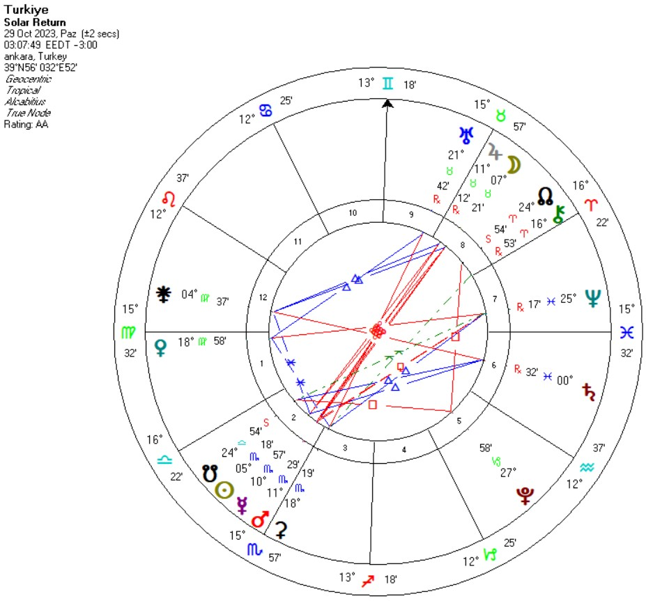 Solar Return haritamızda hem Türkiye haritasının 4.evinin yükselmesi hem de Türkiye natal 4.ve 10. evlerimizdeki Terazi ve Koç aksındaki tutulmalar iç güvenliğimizi tehdit edecek konuların dışında muhalefet içinde anlaşmazlıklar bölünme ve huzursuzluklara (yıllık haritada 4 yöneticisi Jüpiter Boğa’nın dispozitörü Venüs’ün Başak’ta olması) işaret ederken; yeraltı kaynaklarımızla ilgili gelişmeler, denizlerimizde doğal gaz arama çalışmalarını yine gündeme getirecektir. Natal 4.ev Güney Ay Düğümü yönündeki tutulmalar ev ve gayrimenkul fiyatlarının tekrar dengeye oturması anlamına gelebilir.